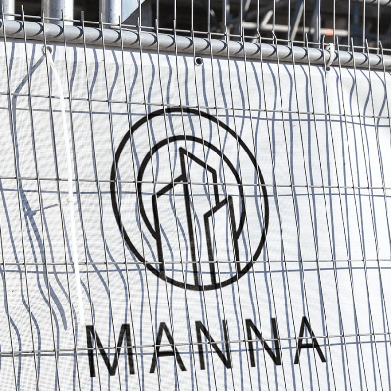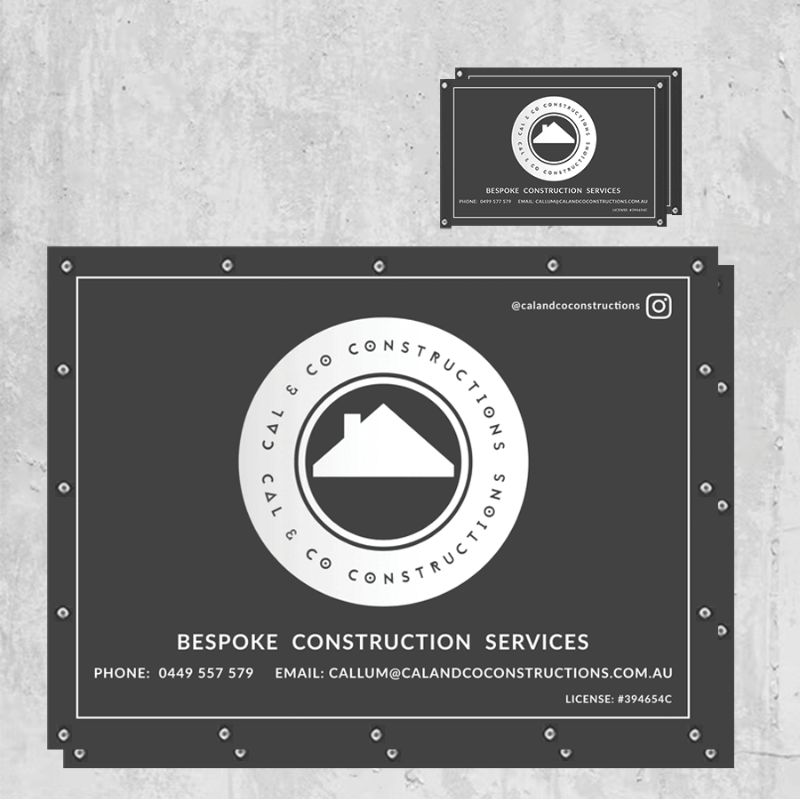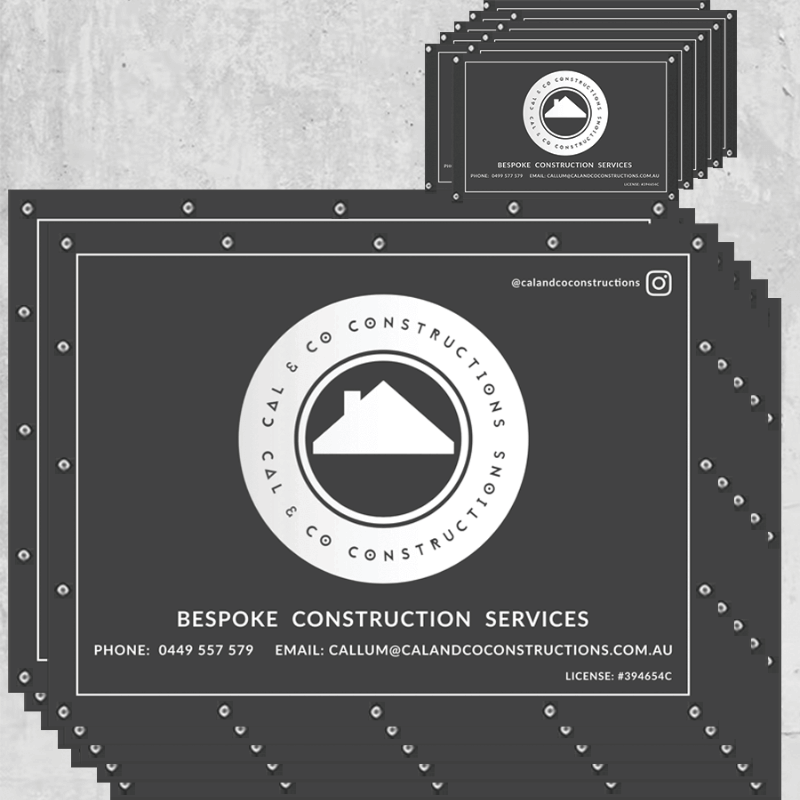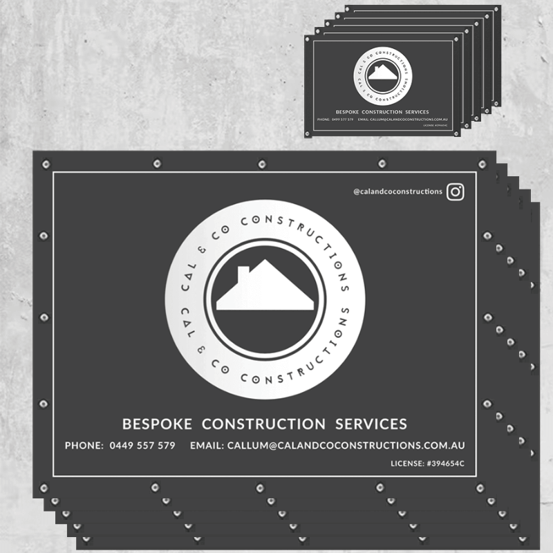 Each pack includes custom-designed vinyl mesh fence panels and branded corflute site signs — printed, finished, and ready to install.